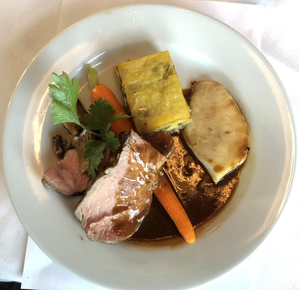 Kalvefilet, kartoffel/porre gratin, glaserede gulerødder, smørstegte selleri, ristede svampe og sauce.