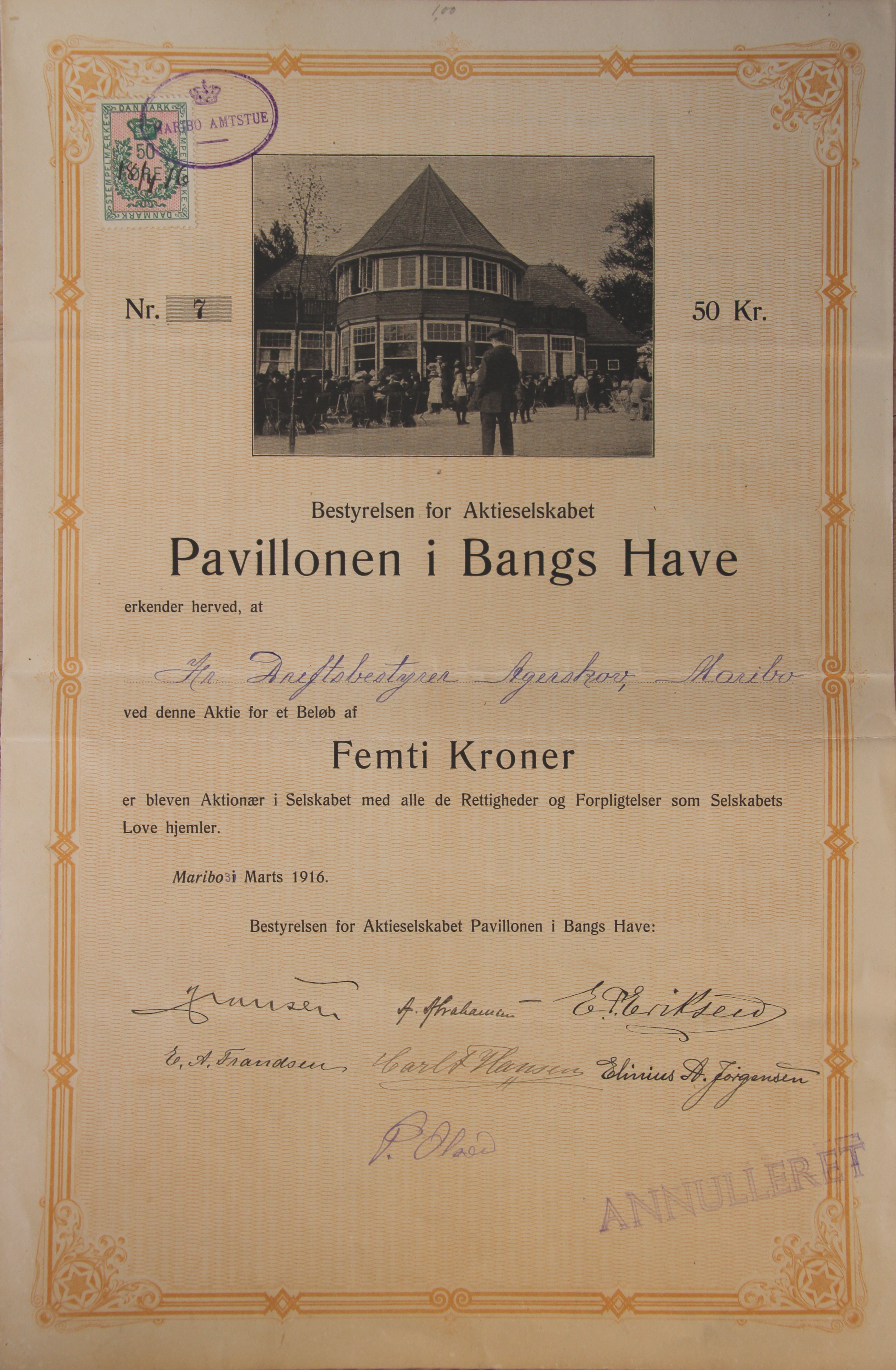 Et aktieselskab med en kapital på kr. 24.950,00 stiftes med det formål “at opføre og drive en pavillon i Bangs Have”. Aktierne lyder på kr. 50,00 og kr. 25,00.